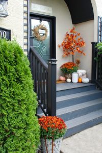 I always like to have something on either side of our front door with some nice height. I used the lighted trees this year, but there are a variety of other items that you could pick. Corn stalks, tall fall branches, fall planters, or topiaries – whatever you like. If you have something a little smaller that you would like to use but still want the height, stack it on a small step stool or turn a box upside down like I did on our fall porch last year.