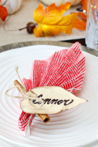 - Cut a leaf shape from cardstock and punch a hole on one end. Write the names of your guests or other Thanksgiving notes if desired. For a more rustic look, crumple up the leaf and add a little brown ink to the edges.